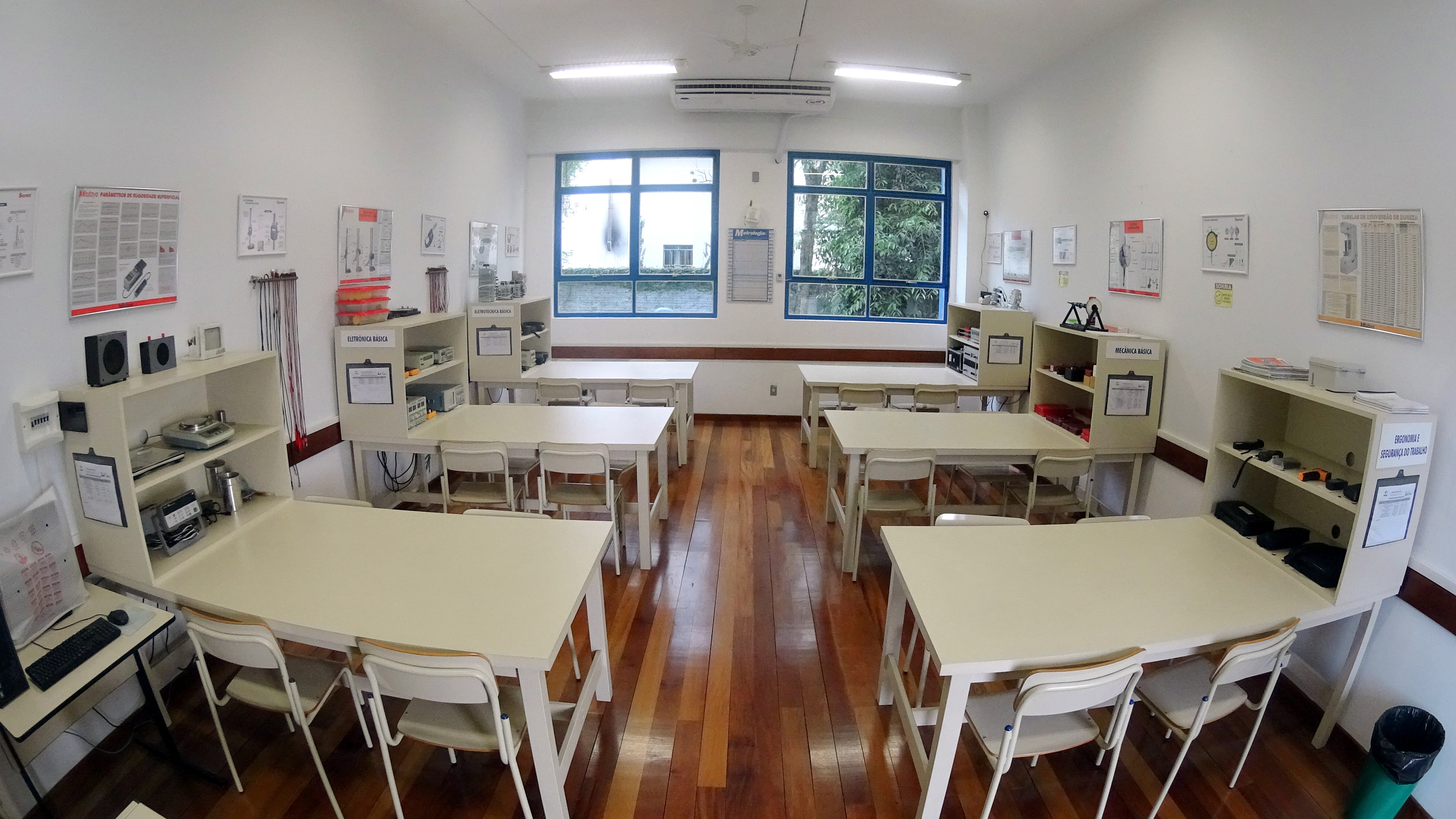 Este laboratório foi projetado para ser possível a demonstração e apresentação prática de instrumentos para medições básicas em eletrônica, mecânica e eletrotécnica. A infra-estrututa foi concebida oportuniza um o aprendizado por estações de trabalho. Isto significa que foram previstas 6 (seis) estações específicas de trabalho, uma para cada tipo de área ou aplicação, sendo: (i) componentes RLC, (ii) eletrônica básica, (iii) mecânica básica, (iv) eletrotécnica básica, (v) segurança do trabalho, e (vi) EMI – Industrial (interferências eletromagnéticas em ambientes industriais). Assim, os alunos organizados em grupos podem simultaneamente passar pelas seis estações de trabalho/ensaios simultaneamente, otimizando o processo de aprendizagem prática.