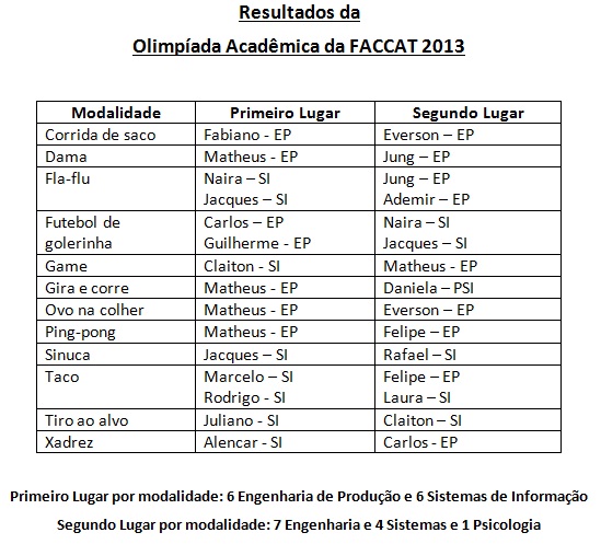 Resultados da Olimpíada 2013 por Prof. Dr. Carlos Fernando Jung - segunda-feira, 21 out. 2013, 17:34 Número de respostas: 0 . Link direto