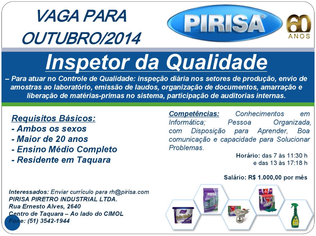 Atenção alunos vaga para atuar na área da qualidade!!! por Prof. Dr. Jung - segunda-feira, 20 out. 2014, 12:00 Número de respostas: 0 Link direto