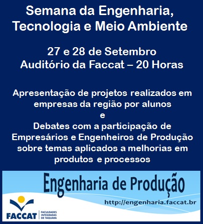 Semana da Engenharia, Tecnologia e Meio Ambiente por Prof. Dr. Carlos Fernando Jung - quarta-feira, 26 set. 2012, 00:45 Número de respostas: 0 . Link direto